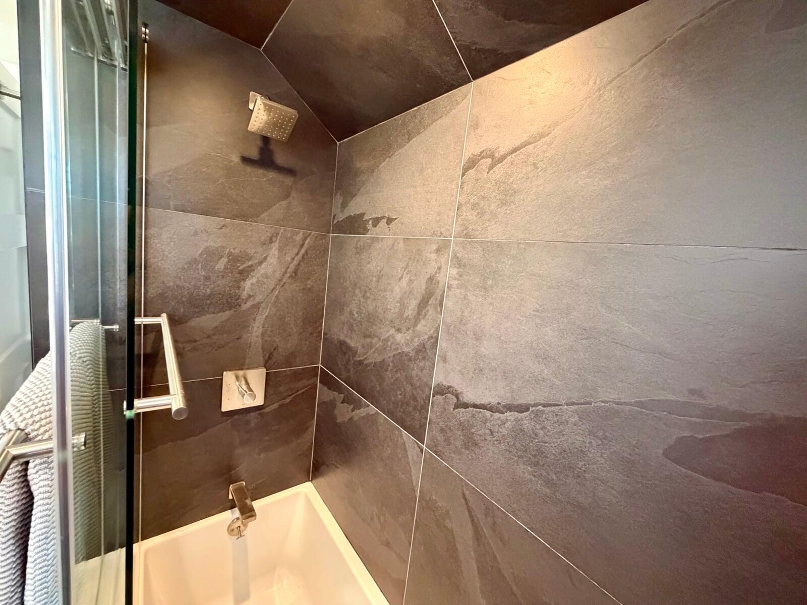The bathroom features oversized tile, modern fixtures, and a sleek glass tub enclosure — bringing a touch of luxury and relaxation to everyday living.
